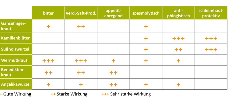 Pflanzliche Arzneimittel haben sich seit Jahrhunderten bewährt. Sie fördernden Weitertransport des Mageninhalts, schützen die Schleimhaut, lindern eventuelle Krämpfe oder Blähungen und regulieren die Säureproduktion. Insbesondere Heilpflanzen, die einen hohen Anteil an Bitterstoffen haben, wirken anregend auf die Speichel- und Magensaftsekretion und die Beschleunigung der Magenentleerung. Darüber hinaus sind sie vegetativ regulierend, entzündungshemmend, tonisierend und appetitanregend. Sie unterstützen ferner die Leber- und Gallefunktion und stimulieren das darmassoziierte unspezifische Abwehrsystem. Außerdem senken sie den pH-Wert des Magens. Je nach Beschwerdebild können weitere Heilpflanzen ergänzend zu den bitterstoffhaltigen Heilpflanzen zum Einsatz kommen. Karminativa (z.B. Anis, Fenchel, Gelbwurz, Koriander, Kümmel, Pfefferminze) dienen beispielsweise der Blähungslinderung, Spasmolytika (z.B. Kamille, Erdrauch, Bilsenkraut) zur Krampflösung, Sedativa (z.B. Baldrian, Lavendel, Melisse,) zur Beruhigung und Quelldrogen (z.B. Flohsamen) zur Stuhlregulation.